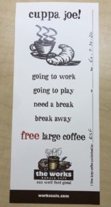 This coupon for a free coffee at The Works shows movement because of the layout of the words. It causes you to read downwards in a way, rather than all left to right.