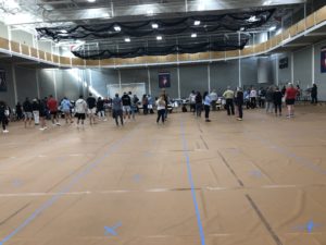 Repetition: Students patiently waiting in line for their Covid test. They are repeated by equally spreading out each student 6 feet apart with those lines and all standing on the blue crosses.