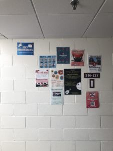 The posters in the hallway are all different colors and sizes, but when they are put together it creates a very appealing and inviting display that makes you want to look at it. The difference in how they are spaced also makes it intriguing how all the posters fit well together and create a nice image overall.