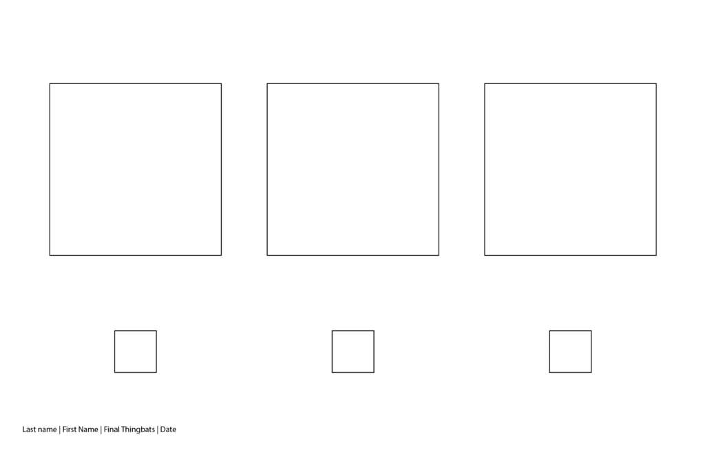 Sketches: lastname_thingbat_sketches.pdf - Using the provided template, place your 9 icons on the 8.5×11 template based on the sketches you’ve made. Export as a high res PDF named: lastname_thingbat_V1.pdf Add this PDF to your 01_Thingbat Folder. We will review on the projector, but please bring a printout as well in black and white on 8.5×11 for me to mark up. You can print for free in 152 and 154.
