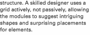 “A skilled designer uses a grid actively, not passively, allowing the modules to suggest intriguing shapes and surprising placements for elements”.  What made this resonate so much for me was that it really emphasized the importance of how information placed in a grid works. The grid is not just the starting point of a design idea, it’s the scaffolding behind the whole design itself. It is what decides the flow of the entire design, beginning the designer with a rough shape to better actualize the intended design.