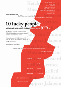 The first Gestalt principle that I believe is highly prevalent in this poster is the Hierarchy principle. This is due to the eyes first looking at the “ten lucky people,” which was purposeful in its pursuit to start the story of how these ten lucky people will win the gift cards. Then, the method by which the ten lucky people will win the gift cards is explained below the part that stands out the most as a secondary component. This is meaningful to me because it presents an opportunity to someone, and should be highlighted among the other text in the receipt as something more than standard information.