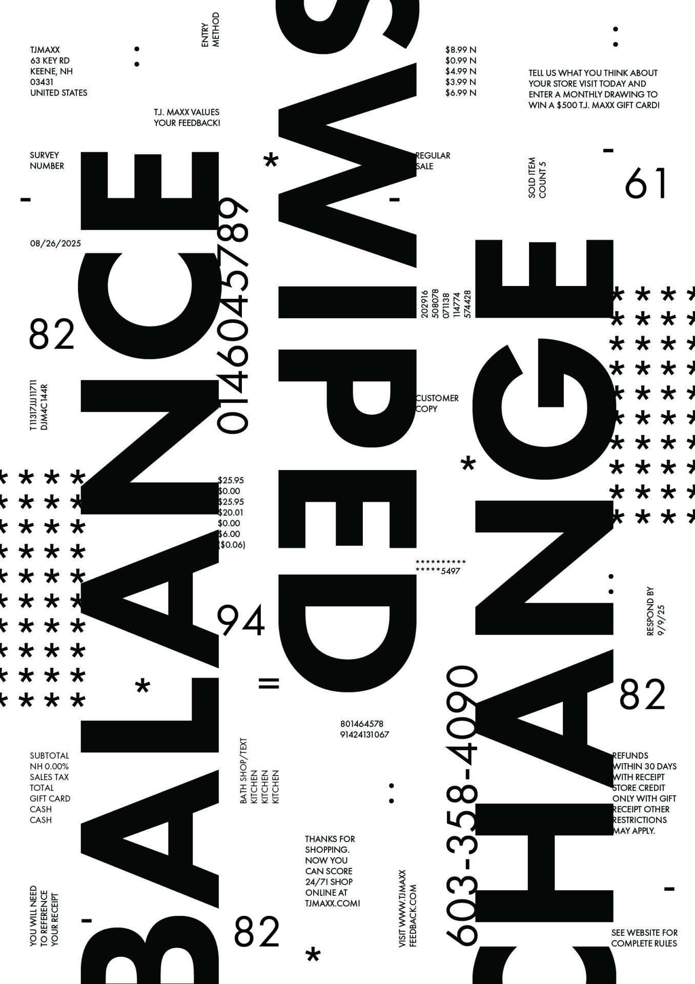 The hierarchy of this poster starts with the large, ‘balance, swiped, change’ vertical type across the poster. This gives you a sense of what the poster is about, a card transaction. I put the words in order of how the transaction would be performed, and made the word swipe travel down the page to evoke a swiping motion. The next level of type is the numbers and patterns. The short numbers correspond with the items purchased, which is more abstract, since taken out of context it is not grouped with the items. I did this to allow the viewer to wonder what they could represent, making you want to read the rest of the information. It also includes other important numbers such as the phone number of the store and the survey number. I included the patterns and punctuation at this size to create visual interest, as we don’t normally see these marks at this size. I liked to think of them as typography sprinkles. The last level of type hierarchy is the small blurbs of text. These contextualize the poster and further the story of the shopping transaction. You are able to see prices, required receipt information, and messages from the store.