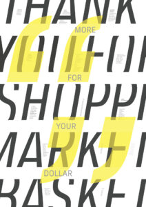 In the chosen poster, you first read “more for your dollar.” Second, you read “thank you for shopping at Market Basket.” Lastly, you read the small supplementary text. The meaning behind the poster was to highlight the corporate jargon Market Basket lists to you, and kind of mask that cheesy language in an edgy, in-motion poster. The main focus is “more for your dollar,” and then when you get closer, you read all of the things that you got for your dollar.