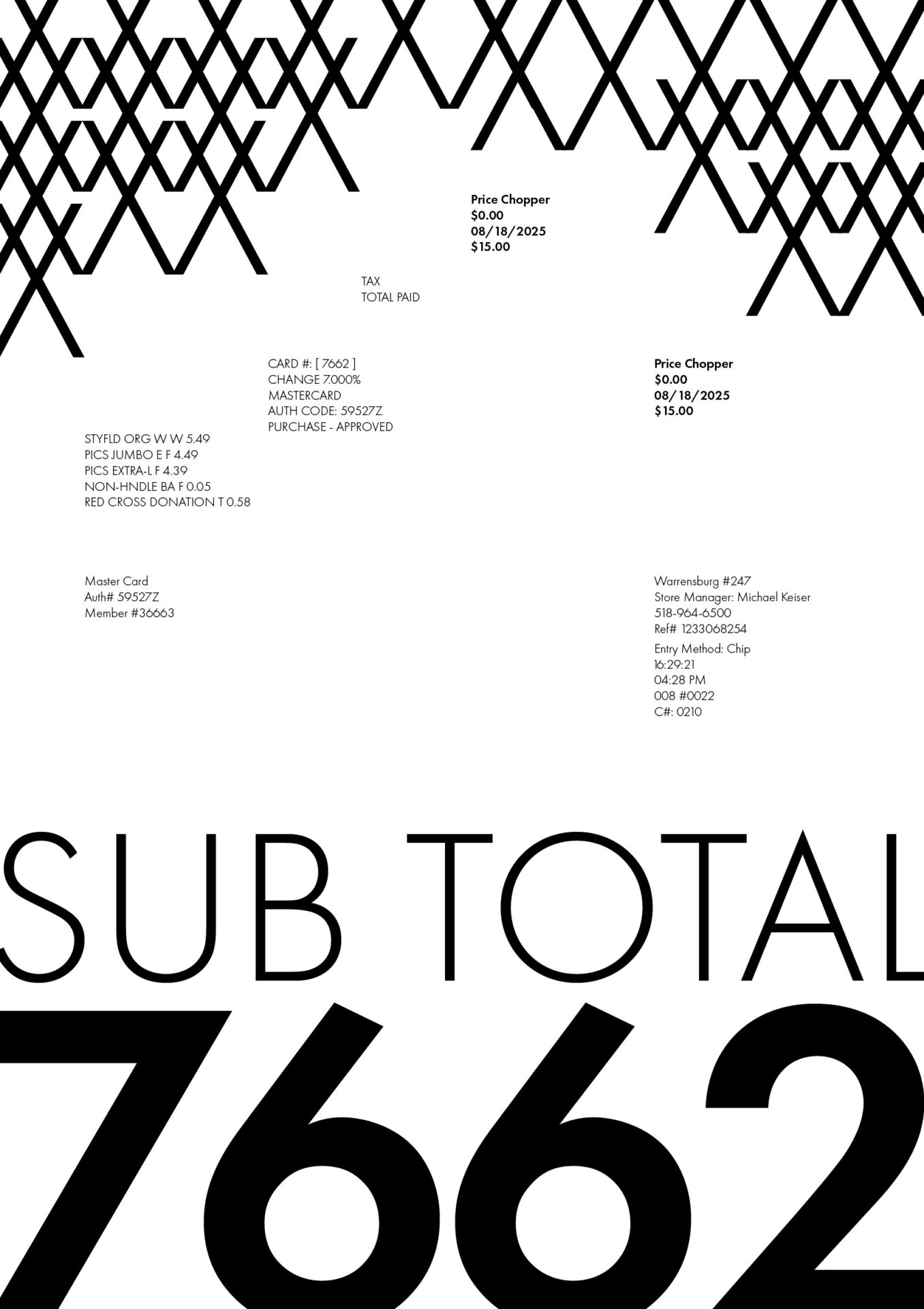 As suggested, I tried to keep the hierarchy to just three sizes of type, including the X’s. I also reduced the size and line weight of the X’s, so they are no longer the first thing the eye is drawn to. The number 7662 is now the focal point of the poster. The X’s are still secondary (along with SUB TOTAL), but they are not as important as they were previously.