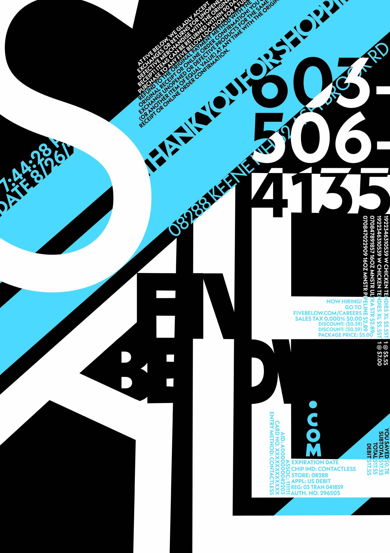 Emergence: Within the type of the Five Below logo in the near center of the poster, not all of the elements of the letter formations are present. However, one is able to fill in the blanks of the missing elements and determine that it indeed says “Five Below”. It is similar to how we as humans read quickly. We readily observe the first and last letter of a word, and the length. It doesn’t seem to matter what order the letters are in between the first and last letter, our brains are still able to read the words effectively. Tihs snetcene gveis an eaxpmle.