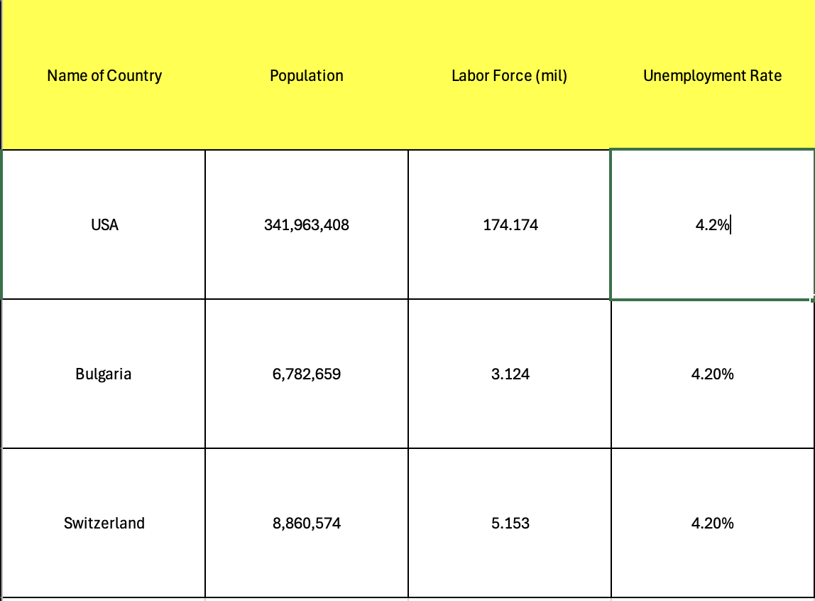 The data I found tells a story about unemployment. Though the total populations and workforces of the 3 countries vary greatly, I noticed they all have the same unemployment rate. I found this interesting because it seems that having a larger labor force doesn’t always mean you have less unemployment.