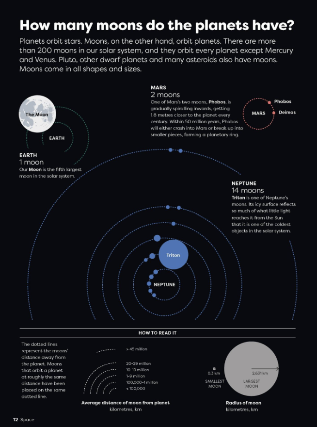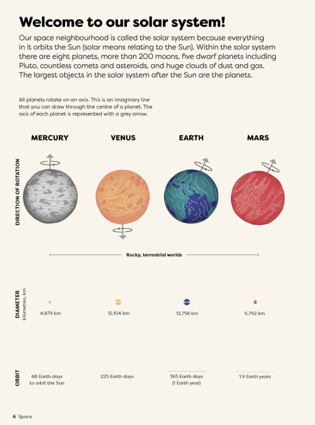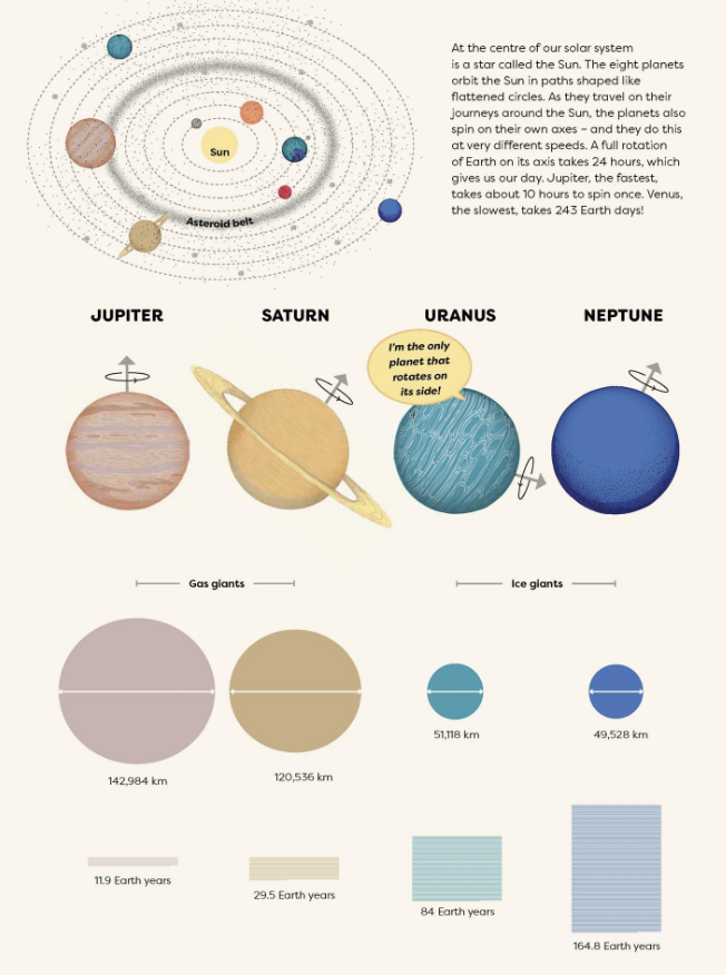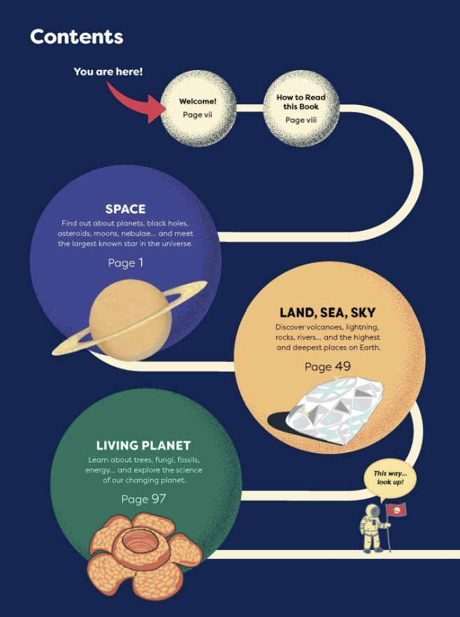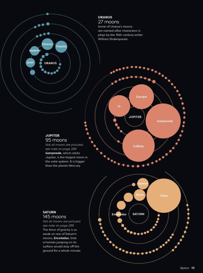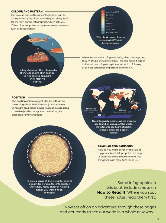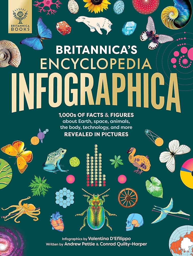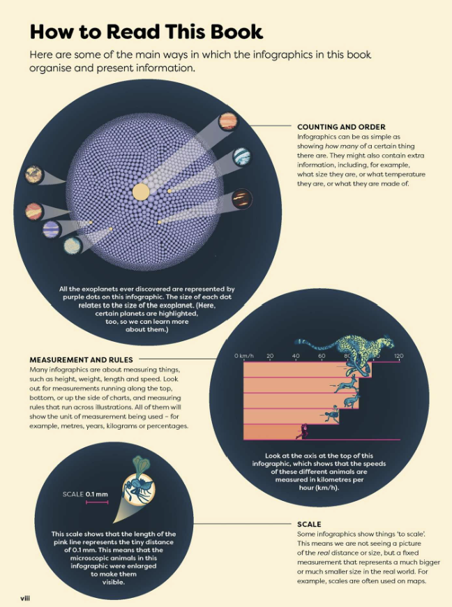 I chose Valentine D’Efilippo’s work on the book Britannica’s Encyclopedia Infographica. This book is designed for children and takes you on an informative journey through “the planet, the universe, the animal kingdom, and our body.” I think this book immediately stood out to me because it feels a little different than some of D’Efilippo’s other designs. A lot of her information design uses thin flowing lines and tiny motifs, whereas her book design feels bolder. I think the use of a broader color palate makes it stand out with high contrast and pop off the page. The illustration style feels whimsical yet scientific, which makes me look at the imagery and want to read about it, a huge win for information design. I think this would create interest, especially for children, to combine their interest for the world to learning information through design.