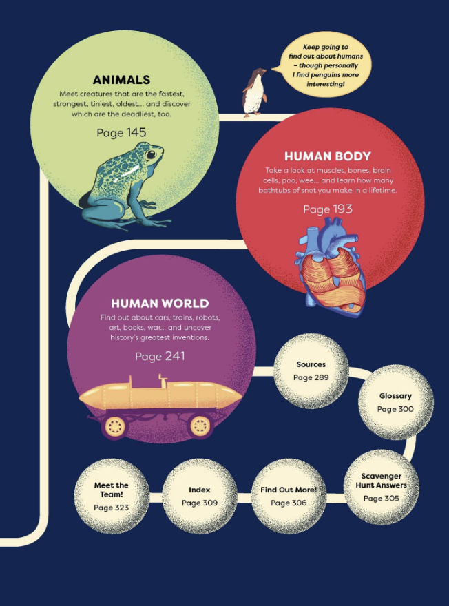 The interior pages is where the information design takes off. The designs feel very bold and childlike, matching the cover with its style and color choices. The type designs on these pages are very simple and clear. Their is an obvious type hierarchy that makes it easy to go through the pages and understand the information. She creates a unique type structure because their is a various amount of illustration set ups on each page. Although the type is places very differently on each page, they completely relate to each other based on how the type itself is set. The placement of the text flows through each page and is overall very effective and makes me want to read more!