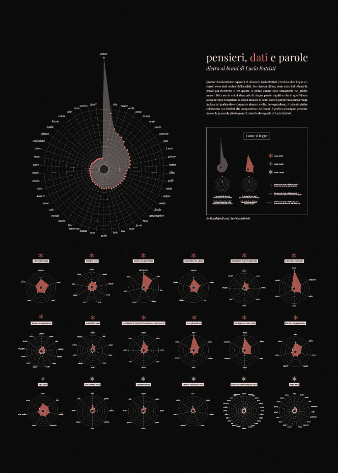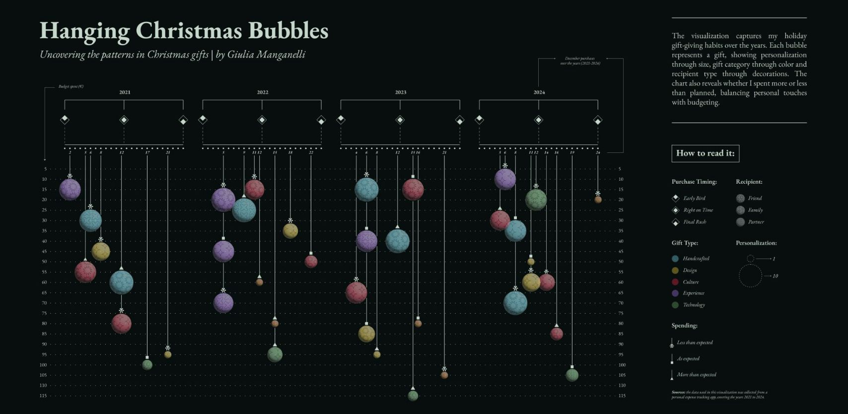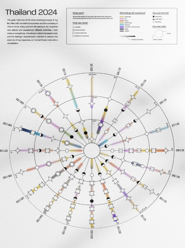 I chose Giulia Manganelli as my second information designer. She currently works at Sheldon Studio, a socially focused data design studio based in Italy. Most of her designs include a very distinct key somewhere on the page in order to decode the design. A lot of her information design seems to be from personal data over an amount of time. For example The Hanging Christmas Bubbles shows information from her Christmas shopping habits over a few years, and the Thailand 2024 design organizes information about her experiences during a month long trip through Thailand. I chose Giulia Manganelli because it looks like she experiments a lot with her set up of the information design. I like that she is trying different ways to display the information!