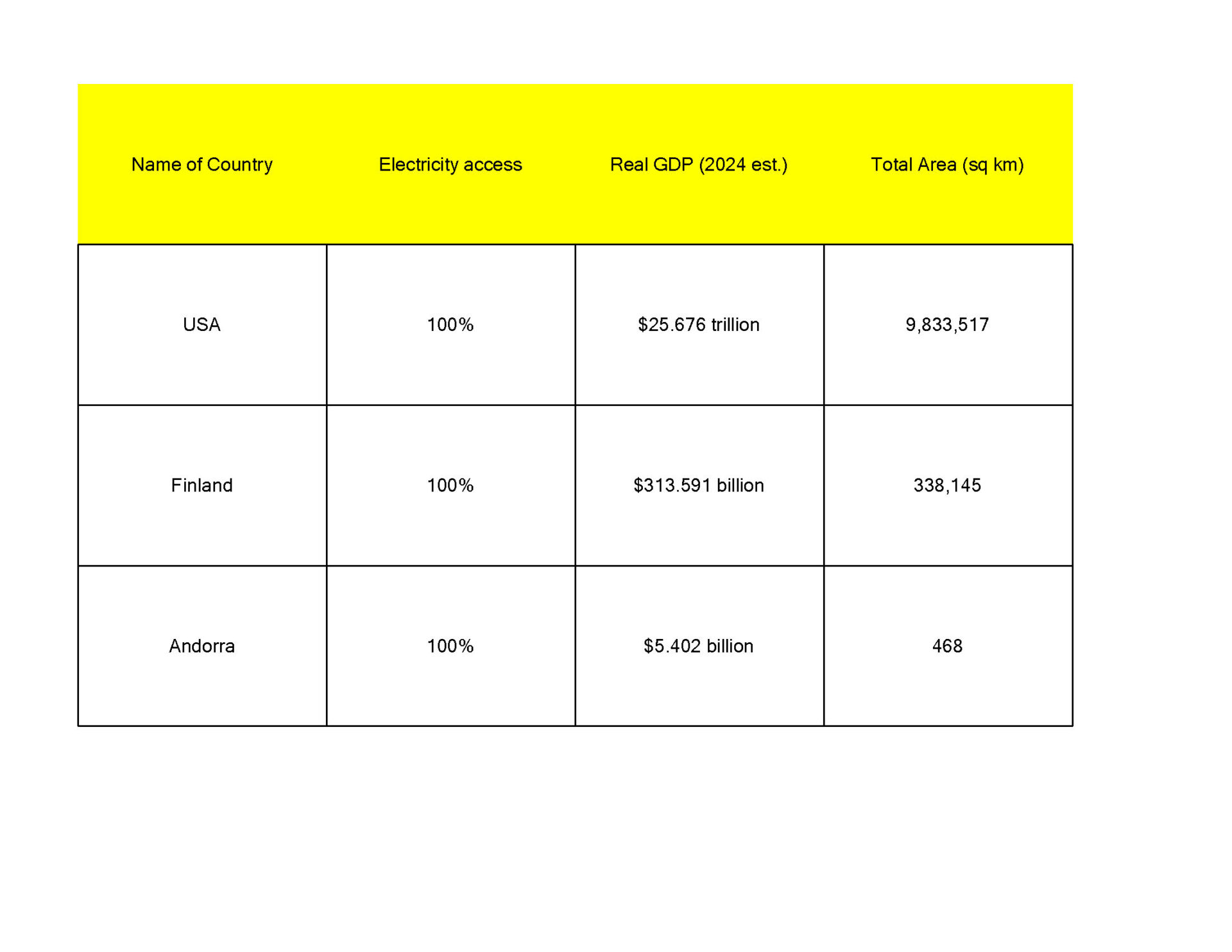The story I hope to show in this data is how countries of different sizes and wealth have a grasp on electirifying their populations. I find this interesting because of how just because a country is small or it seems like they have much less in comparison to the united states, it can still be just as competent with their reces, if not better. Finland for instance is much farther along then the United States is as they have recently shut down their last coal mine in April this year and as of 2019 had banned coal mining entirly to move forward with technology and cut energy costs. Andorra is embracing renewable energy, cutting its reliance on imports and decreasing energy poverty. Using solar, hydropower and biomass, the nation is balancing sustainable growth, lowering costs and improving access. All this while the country with the most land mass and highest GDP dives further into the deep end of fossil fuels as well as killing its own grid with increasing AI energy demands.