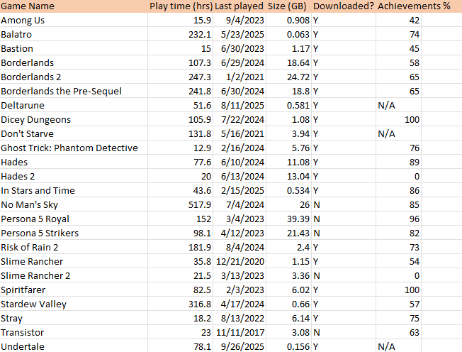 - I went through my Steam account and collected data on all the games with over 10 hours of playtime.