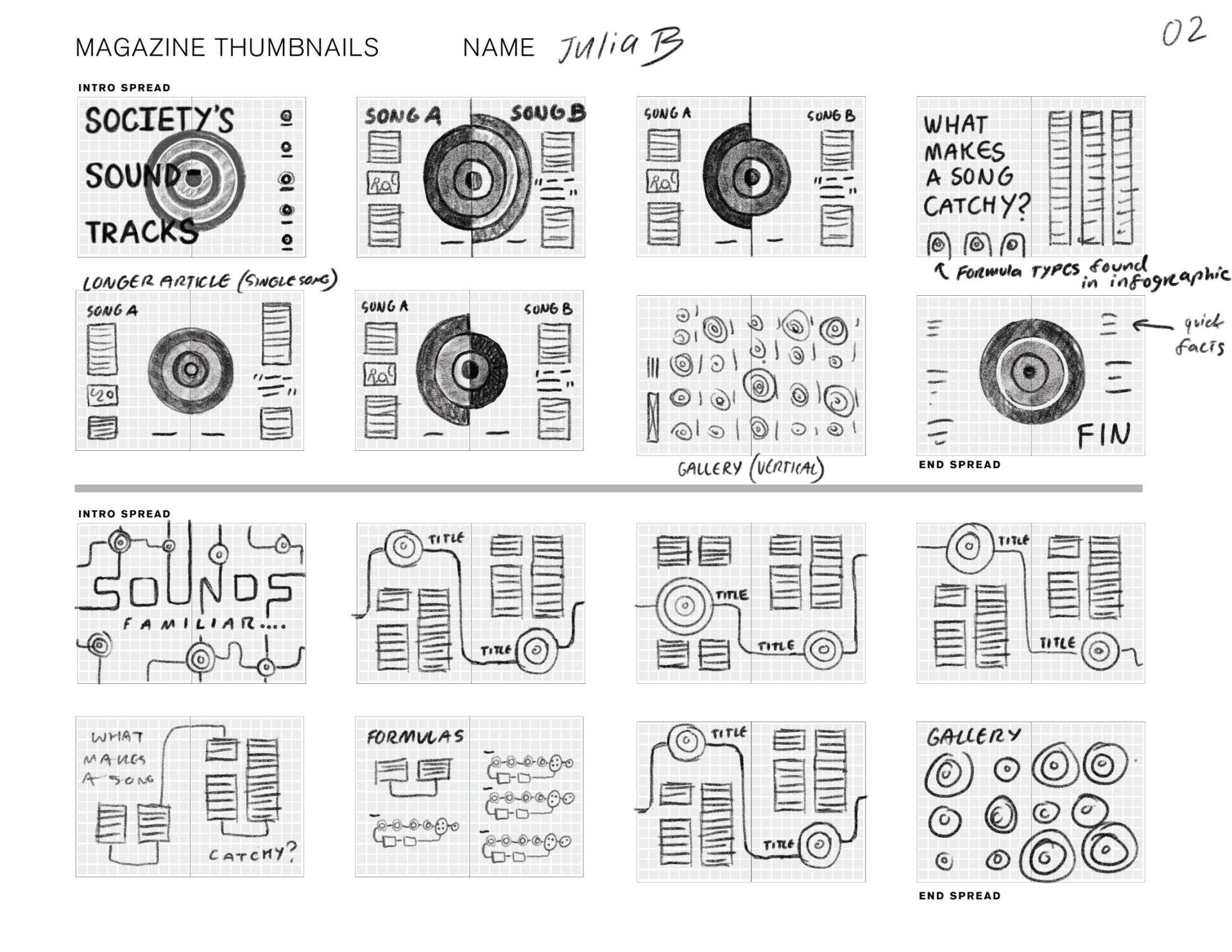 - I’m thinking of including one interlude article in the middle of the spreads, which will most likely be the Penn State article, “What makes a Song Catchy?” Along with this article, I want to include some of the song “formulas” I created in my infographic as another layer and a visual.