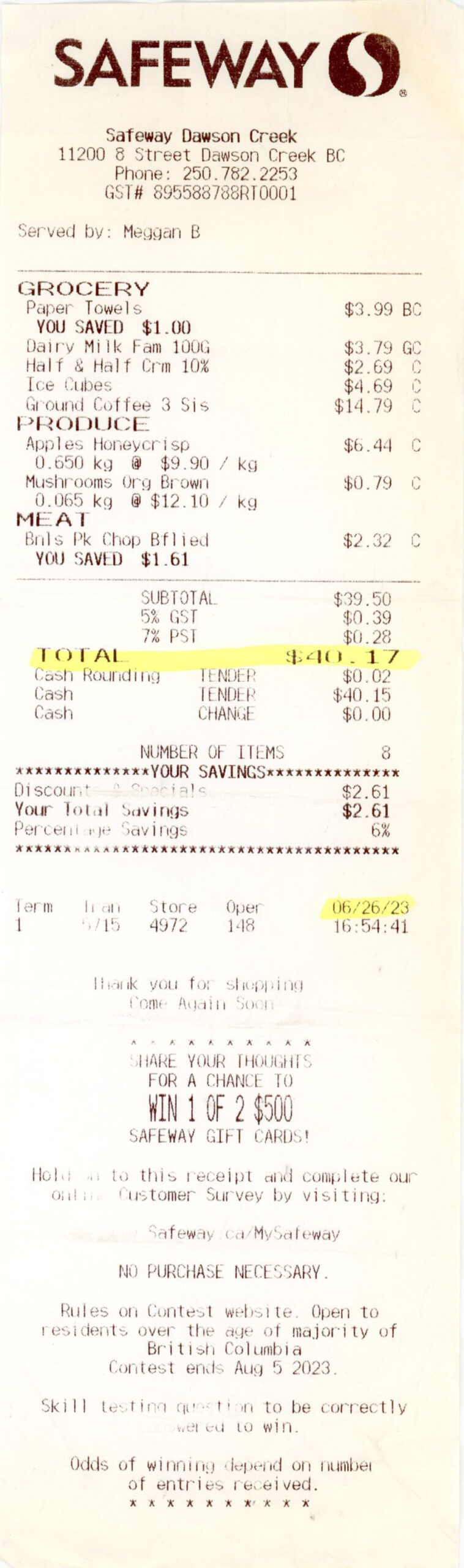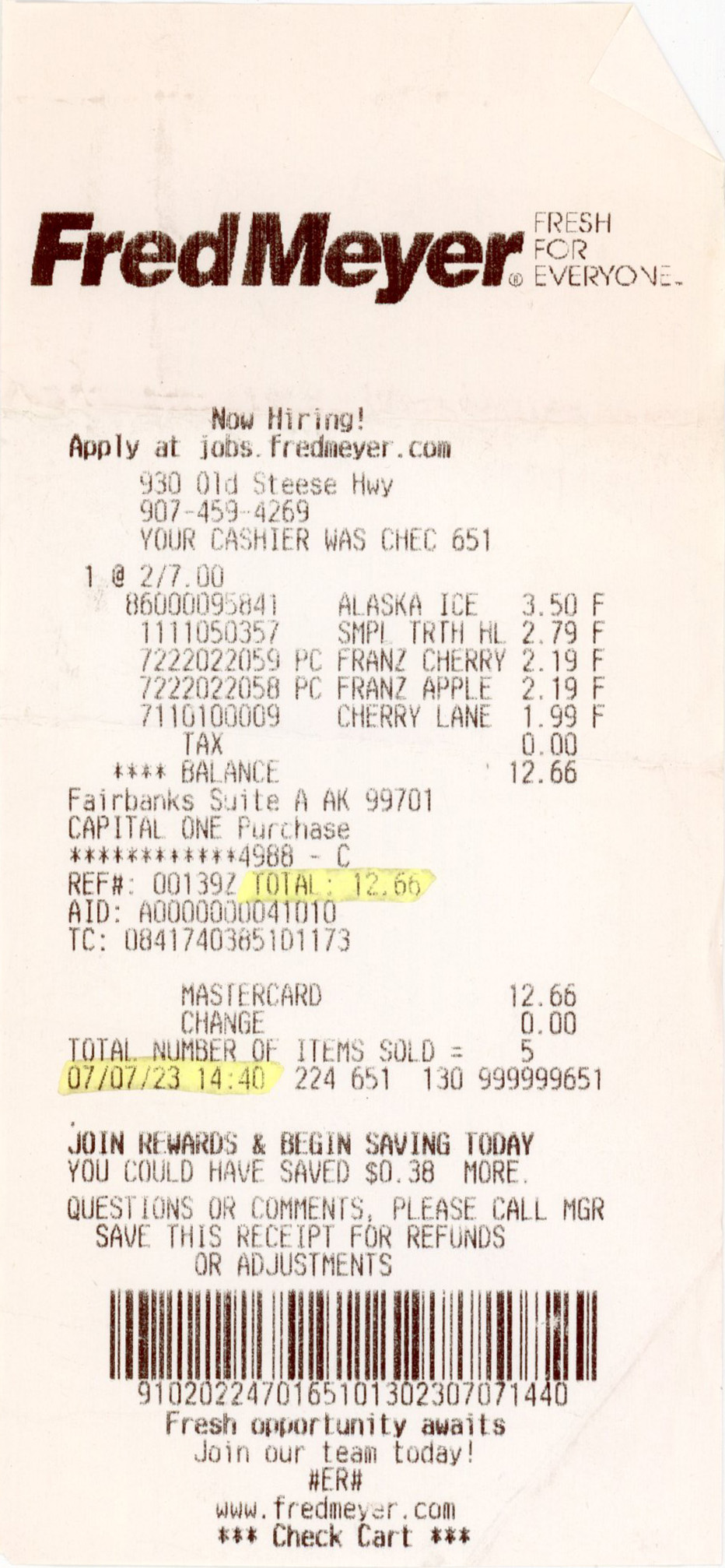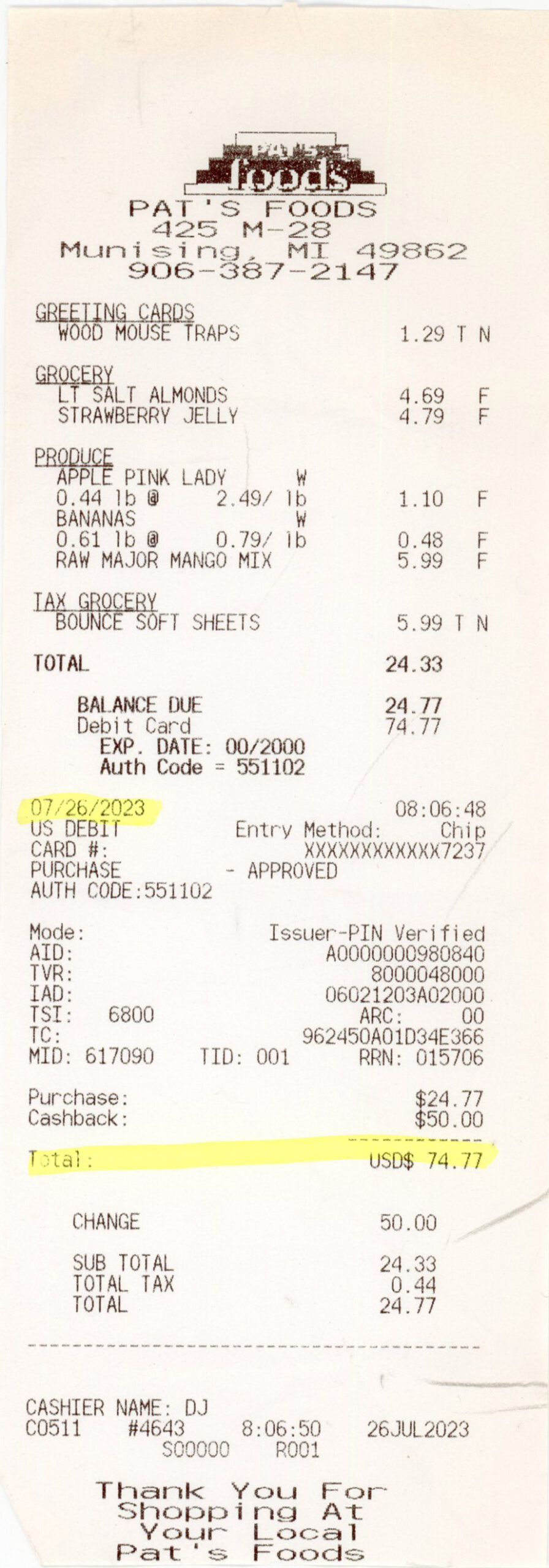 Date/Items/Cost/Slogan/cashier/payment/etc ?